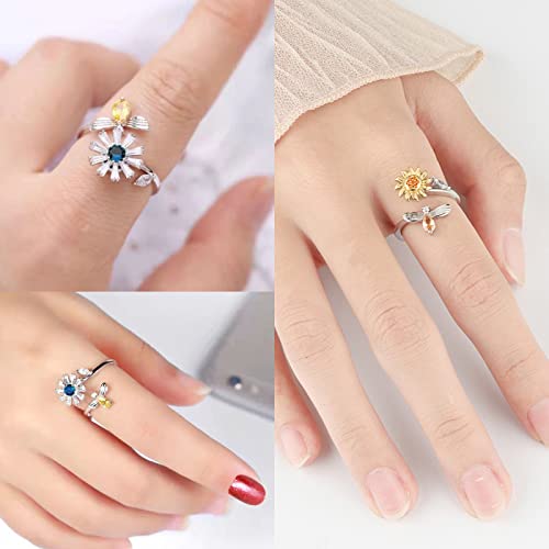 Ellxen 2PCS Anelli l'Ansia Spinner Anelli Piccola margherita girasole Anelli Sottili Regolabili Fidget Anello Antistress Anelli Anello Donna Acciaio Inossidabile Zircone Fiore Anelli Set