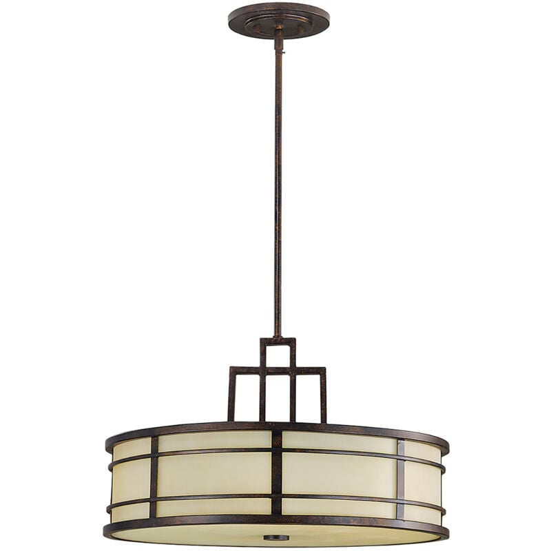 Collezione Fusion COMBINA ARTE E STILE Lampada a sospensione a 3 luci . Fusion combina elementi dello stile Arts & Crafts per creare un design con bande lineari verticali e orizzontali, che creano un bellissimo contrasto con il paralume e il diffusore in vetro ambrato scanalato.