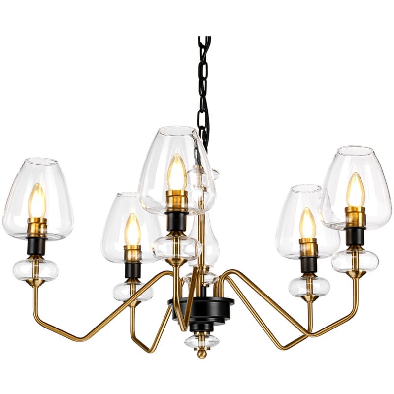 Collezione Armand UN TOCCO DI CONTRASTO Lampadario a 5 luci - Ottone invecchiato. Armand è una vasta gamma di lampade da soffitto adatte a un'ampia gamma di spazi interni, in due finiture molto contrastanti: ottone invecchiato/carbone o classico nichel lucido. Gli esclusivi paralumi in vetro e i bracci angolari creano una silhouette audace e una rivisitazione del classico stile delle lampade con braccio a J.