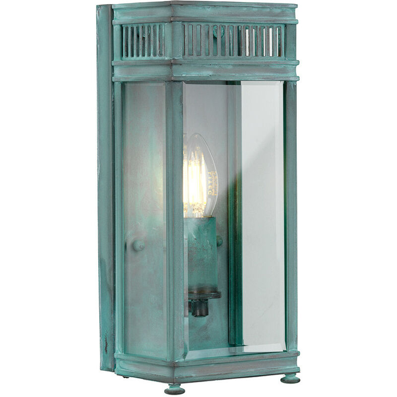 Elstead Holborn Lanterna da esterno a parete Verdigris, IP44 | Finitura: Verdigris | Materiale: ottone, vetro trasparente | Classificazione IP: IP44 | Altezza: 31cm | Larghezza: 13 cm | Profondità: 11 cm | Diametro: 13 cm | Tipo di lampada: E14 | N. di lampade: 1 | Lampadina inclusa: No | Potenza (massima): 40W