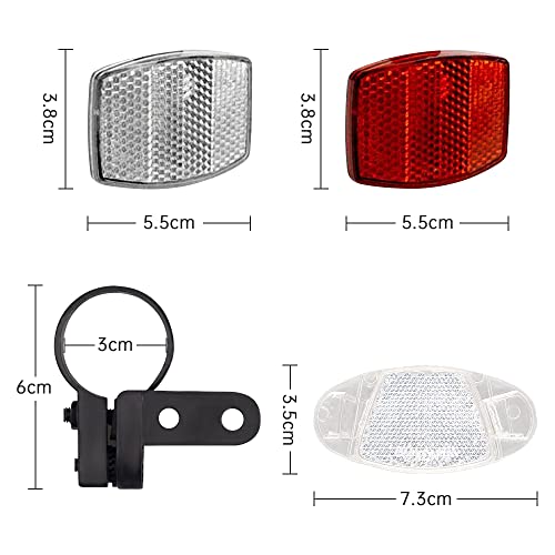 Riflettori per bici abbondanti: riflettore posteriore per bici rosso 2 pezzi, riflettore anteriore per bici bianco 2 pezzi e nastro riflettente bianco 4 pezzi, quantità sufficiente per soddisfare le tue esigenze, i riflettori per bici possono aumentare la visibilità al buio e rendere sicura la tua guida notturna.