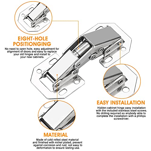 Posizione a otto fori e facile da installare: posizionamento a otto fori, non è necessario aprire il foro, facile regolazione per l'allineamento delle porte e facile sostituzione delle vecchie cerniere e installazione sui tuoi nuovi armadi. Basta collegare l'installazione con un cacciavite. Non c'è bisogno di praticare fori e possono essere montati in vari modi per una perfetta vestibilità.