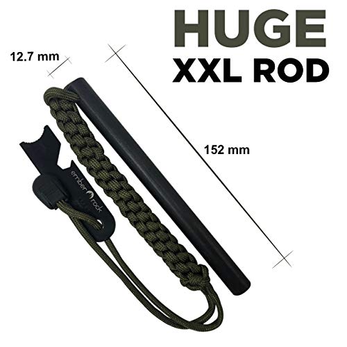 Ember Rock XXL Firesteel Fire Starter, acciarino con enorme barra in ferro cerio, accessorio per sopravvivenza, 152 mm x 12,7 mm, cordino in paracord, con raschietto multiuso, Verde militare