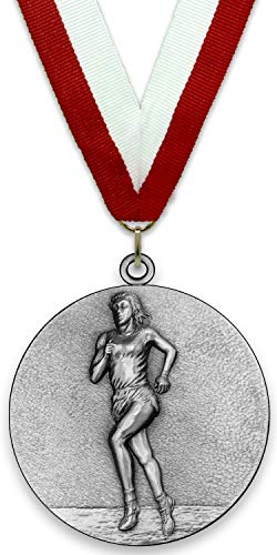 Emblemarket - Medaglia in Metallo Personalizzabile - Running Donna - Colore Argento - 6,4 cm - Nastro a Scelta Incluso