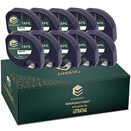 EMBRIIO 91201 S0721610 Kit 10 Nastro per Etichette Plastica Sostituzione per Dymo LetraTag LT-100H LT-100T LT-110T QX50 XR XM 2000 Plus | Nero su Bianco | 12 mm x 4 m