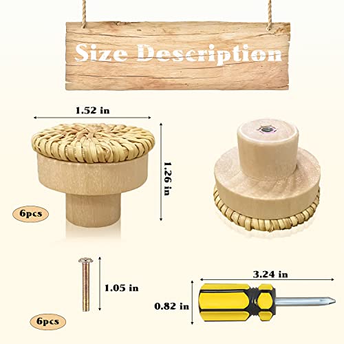 EMHTHME 6 Pezzi Pomelli per Mobili Legno Rattan, Vintage Naturale Pomelli Maniglia, Maniglia del Cassetto, Manopole in Legno Rattan, per Guardaroba Armadi e Cassetti(con cacciavite e viti)