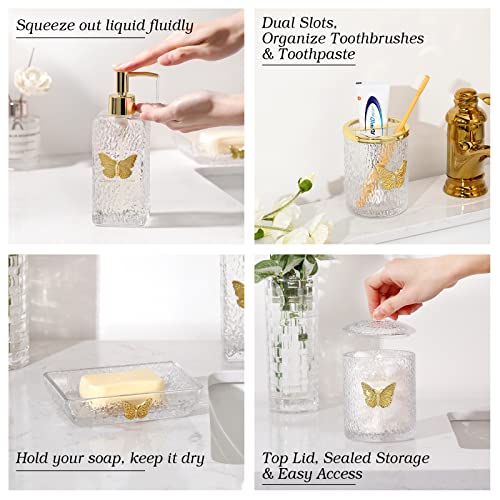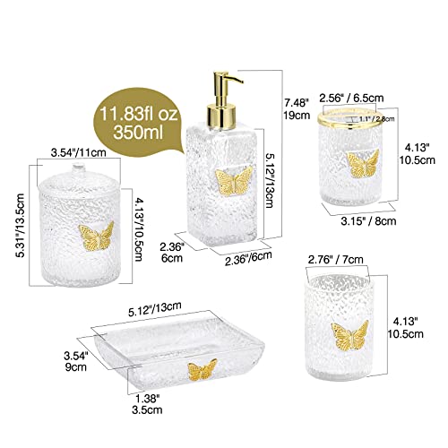 Emibele Set di Accessori da Bagno 5 Pezzi, Kit Accessori Bagno in Vetro, Bagno Accessori, con Farfalla Dorata, Dispenser, Portasapone, Bicchiere, Portaspazzolino, Porta Tampone di Cotone, Chiaro e Oro