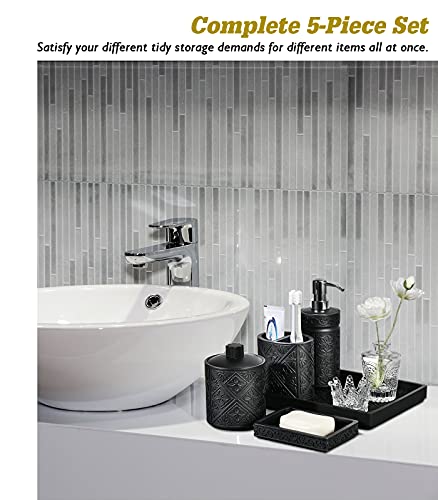 Emibele [5 Pezzi Set di Accessori da Bagno, Dispenser per Sapone Vassoio in Resina Portaspazzolino Portasapone e Contenitore per Tamponi di Cotone con Coperchio in Bassorilievo - Nero