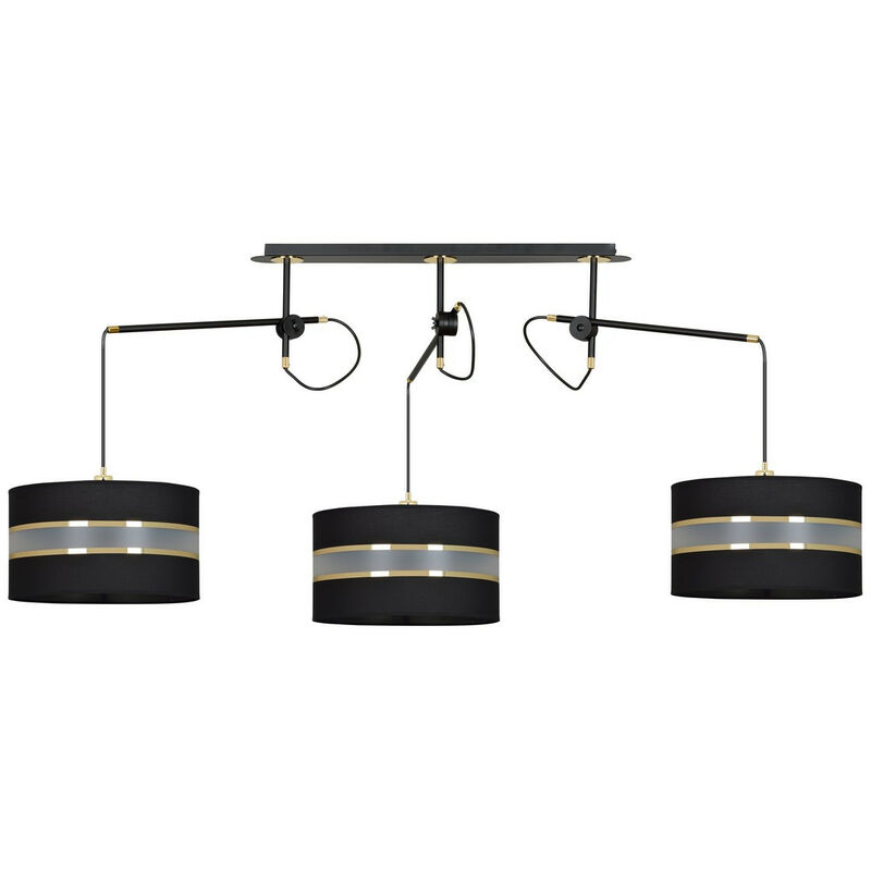 Emibig KORNO Plafoniera a sospensione nera con paralumi in tessuto nero e oro, 3x E27 | Finitura: nero | Materiale: acciaio, paralume in tessuto | Grado di protezione IP: IP20 | Altezza: 100 cm | Larghezza: 150 cm | Diametro paralume: 35 cm | Tipo di lampada: E27 | N. di lampade: 3 | Lampadina inclusa: non inclusa | Dimmerabile: Sì - Sono necessarie lampadine dimmerabili | Peso: 3,4 kg | Potenza (max): 60 W