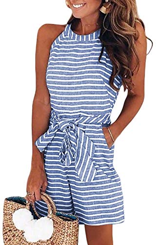 Emmarcon tuta tutina estiva corta casual a righe vestito donna da spiaggia con tasche senza maniche (50-52, Blu)