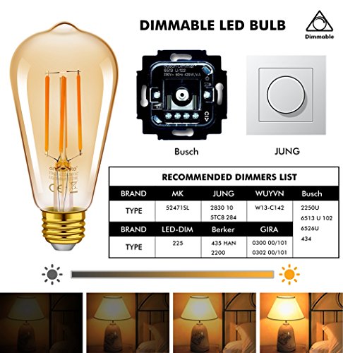 [AMBRA AMARABILE DIMMERABILE] 400 lumen di 2200K di luce ambra, le lampadine di vetro in vetro color ambra sono costruite con un design attraente a forma di lacrima, produrre una calda luce ambrata e darti un tocco antico! Le funzioni di attenuazione graduale del 100-20% sono compatibili con la maggior parte dei dimmer LED, utilizzando i dimmer consigliati (mostrati in Fig.3) per aggiungere un bagliore invitante e un umore perfetto a qualsiasi spazio
