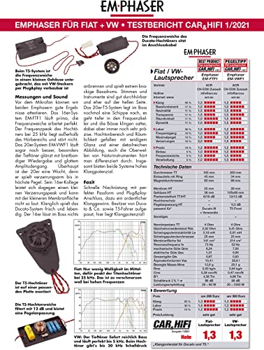 Altoparlante specifico per VW T5 di Car Audio Specialist Emphaser, con il quale si può facilmente aggiornare il suono supersono: il sistema di componenti a 2 vie EM-VWF1 il cui suono, caratteristiche di installazione e collegamenti sono perfettamente adattati al Bulli. Il nuovo sistema per T5 Transporter e camper è 100% Plug & Play, quindi può essere sostituito con il minimo sforzo di installazione con il sistema originale.