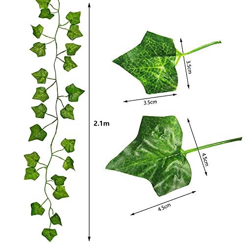 【Dimensioni】La confezione contiene 12 viticci di edera artificiale e 20 fascette per cavi verdi. Ogni lunghezza: circa 2,1 m, dimensione del foglio grande: circa 4,5 x 4,5 cm, dimensione del foglio piccolo: circa 3,5 x 3,5 cm.
