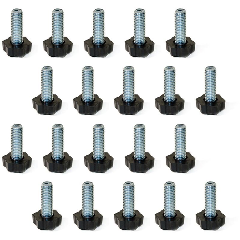 Piede livellatore per la regolazione in altezza dei mobili fabbricato in acciaio e plastica e fornito in set da 20 pezzi. Servono di un dado M8 per l'assemblaggio (non inclusi nella confezione). Permettono mettere in bolla i mobilli di casa (tavoli, sedie, divani, ecc.) grazie alle loro viti filettate M8x30mm. Base esagonale in plastica nera per proteggere il pavimento.