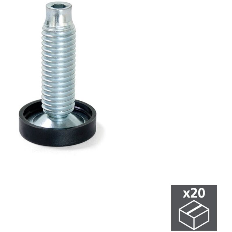Piede livellatore per la regolazione in altezza dei mobili fabbricato in acciaio e plastica e fornito in set da 20 pezzi. Servono di un dado M10 per l'assemblaggio (non inclusi nella confezione). Mettono in bolla i mobilli di casa (tavoli, sedie, divani, ecc.) grazie alle loro viti filettate M10x30mm, che permettono la regolazione dall'interno del mobile con una chiave esagonale n°4 (non inclusa). Base circolare Ø23mm con tappo in plastica colore nero per proteggere il pavimento. Siccome é articolato riesce ad adattarsi perfettamente al dislivello della superficie di appoggio.