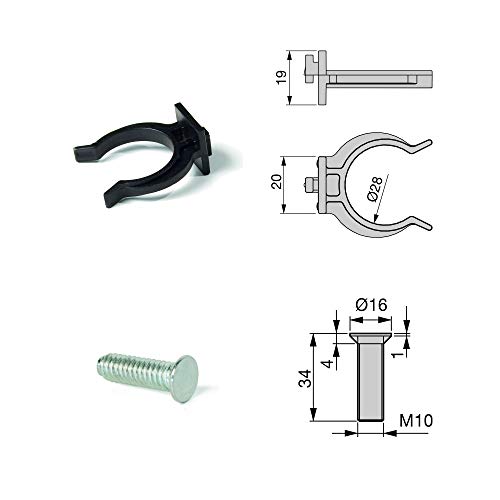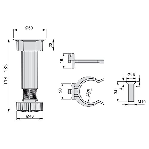 Ogni set comprende: 4 piedini regolabili con piastra di fissaggio integrata, 4 viti di fissaggio e 2 clips per zoccolo