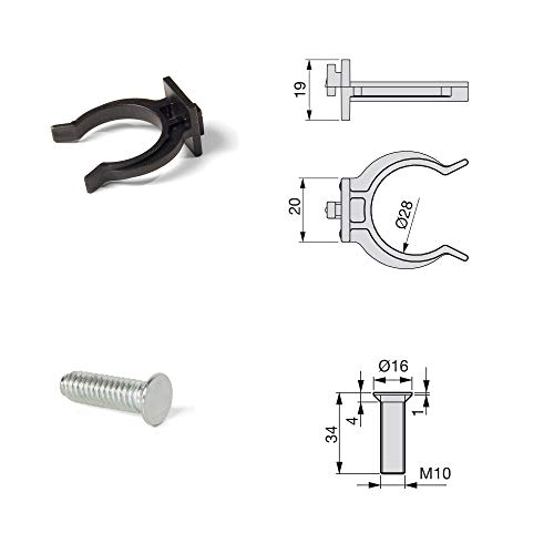 Ogni set comprende: 4 piedini regolabili con piastra di fissaggio integrata, 4 viti di fissaggio e 2 clips per zoccolo