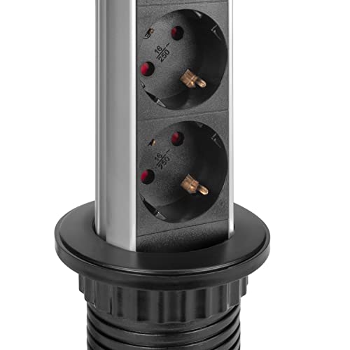 Emuca - Blocco multipresa a scomparsa con 3 prese schEUo EU e 2 porte USB, torretta multipresa a scomparsa per piano lavoro di cucina o scrivania, Verniciato nero, Tecnoplastica e Alluminio