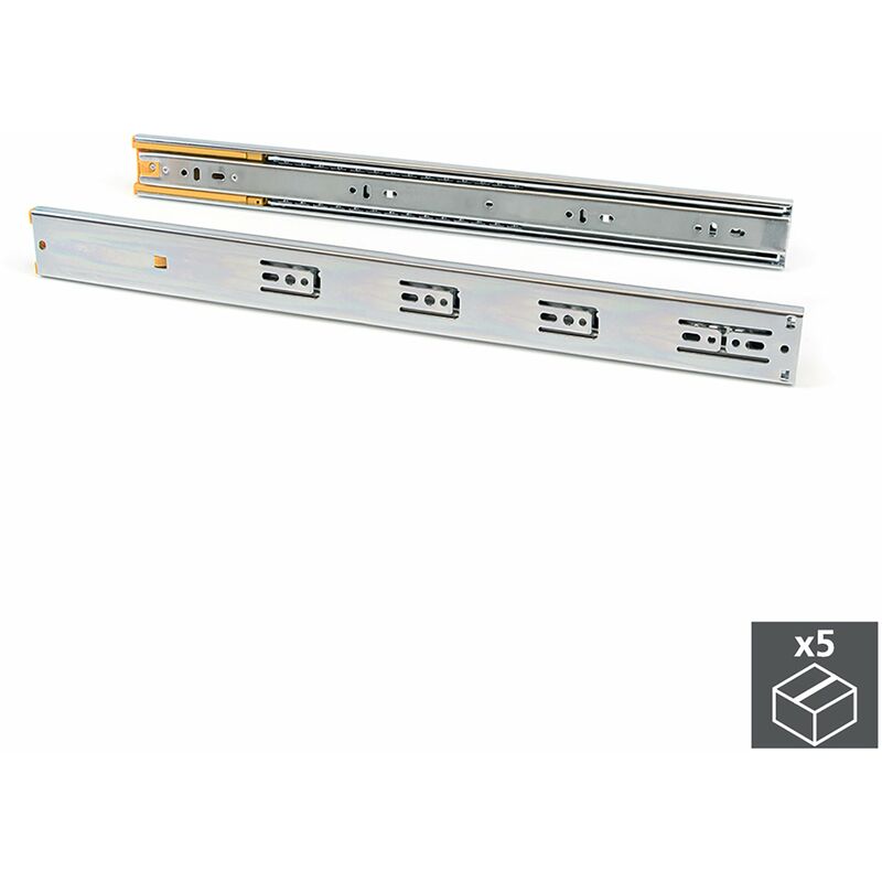 Guide con estrazione totale per cassetti con chiusura soft che fornisce una chiusura ammortizzata del cassetto, e uno scivolamento morbido e silenzioso grazie ai suoi cuscinetti a sfera di alta qualit�. Sono noti, inoltre, per la grande capacit� di carico che pu� arrivare a sopportare fino a 35 kg per cassetto. Il montaggio al cassetto si realizza mediante viti e lo smontaggio con grilletto. Guide con cuscinetti a sfera ed estrazione totale del cassetto. In acciaio zincato. Altezza 45 mm. Lunghezza 600 mm. Carico massimo per set di 35 kg. Si forniscono in set completi. Dispongono di un pistone ammortizzante in entrambe le guide, che fornisce una chiusura soft del cassetto. Possiede un grilletto per lo smontaggio della guida. Lotto di 5 set di guide a sfera L 600 mm Zincato bianco Acciaio