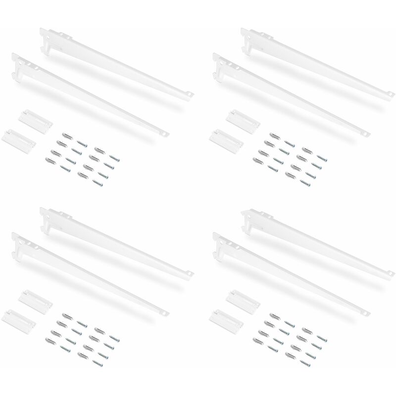 Kit accessori per realizzare mensole su misura fissate a parete. Sono ideali per attrezzare l'interno di armadi, spogliatoi, lavanderie o dispense. Possono essere abbinati agli accessori Jagmet per realizzare un'ampia gamma di composizioni. Questo kit � composto da otto piastre di fissaggio e quattro set di reggi mensola (destro e sinistro) progettati per l'installazione di quattro ripiani in legno. Include anche le viti ei tasselli per il montaggio a parete. Kit accessori per realizzare mensole su misura fissate a parete. Si compone di otto piastre di fissaggio e quattro set di supporti (destro e sinistro) per l'installazione di quattro ripiani in legno. Sono realizzati in acciaio laccato bianco che conferisce al sistema un'elevata resistenza. Le staffe di lunghezza di 380 mm supportano un carico di 22 kg per ripiano. Include anche 32 viti �4.2x32mm e 32 tasselli �6x30mm per il fissaggio a parete. 8 piastre, 4 set di staffe da 380 mm (destra e sinistra), viti e tasselli di