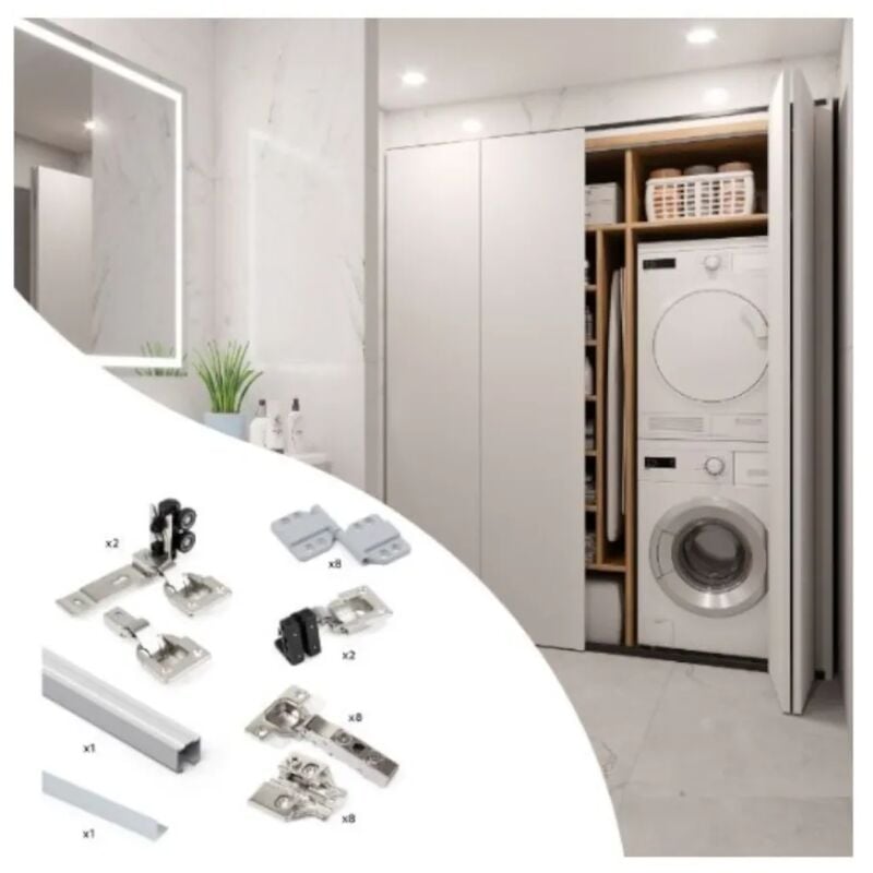 Caratteristiche del prodotto Sistema per anta in legno pensile e pieghevole per montaggio in ampi armadi con chiusura ammortizzata.Il sistema di ante scorrevoli a libro Twofold in formato kit comprende tutti gli strumenti necessari per montare un armadio con 1 anta pieghevole tranne i pannelli. Questo sistema trova largo impiego in piccoli spazi dove non è possibile inserire armadi con ante a battente. Le cerniere comprese nel kit sono con chiusura ammortizzata e fissaggio tramite clip supplementi che sono a loro volta inclusi nella confezione. Si distingue per lo scorrimento molto scorrevole, la capacità di carico di 50 Kg per sistema (25 Kg per anta) e la versatilità del suo montaggio, potendo essere installato in diversi modi a seconda del campo di utilizzo e della tipologia di armadio da montare. Il Kit è disponibile in due versioni: Doppio kit con chiusure morbide e profilo di guida inferiore per armadi di grandi dimensioni(6117562). Doppio kit con chiusure morbide senza profilo