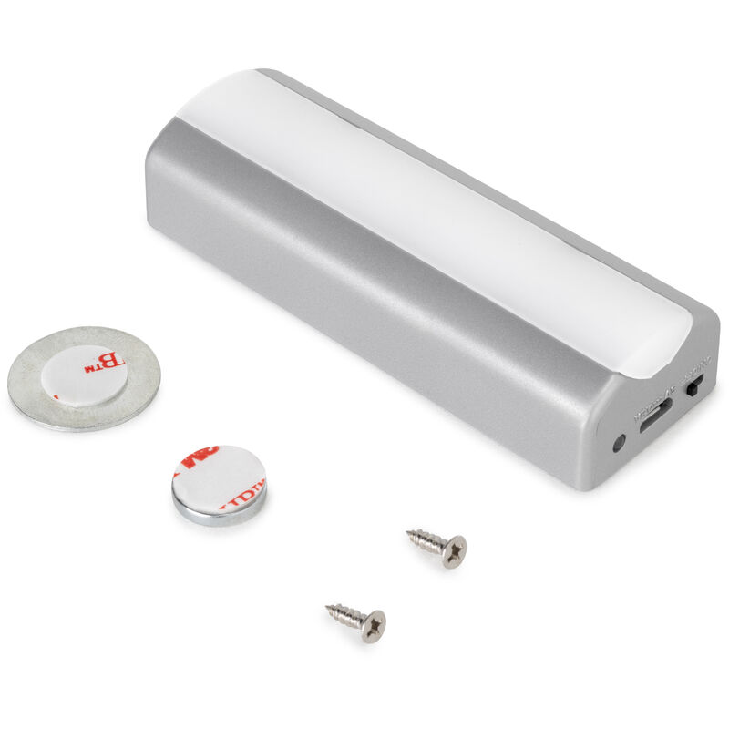 La lampada LED Rigel è progettata per illuminare l'interno dei cassetti dei mobili. È dotata di un sensore che rileva la vibrazione del cassetto quando viene aperto e accende la lampada per 12 secondi, per poi spegnerla automaticamente grazie al timer. In questo modo, l'apparecchio consente di illuminare l'interno del cassetto quando è aperto con una luce bianca naturale. La lampada è dotata di una batteria ricaricabile ai polimeri di litio da 850 mAh con un'autonomia di 600 cicli di accensione prima che la batteria si esaurisca. Si consiglia di ricaricare l'apparecchio con un caricatore convenzionale per cellulari da 5V DC 0,5A con connettore micro USB di tipo B (non incluso). Il tempo di ricarica completa stimata è di 2 ore, ma varia in base all'amperaggio del caricatore. Per verificare lo stato di carica, è presente un indicatore LED che passa da rosso a verde quando la carica è completa. Inoltre, è dotato di un interruttore per accendere o spegnere manualmente l'apparecchio. L'