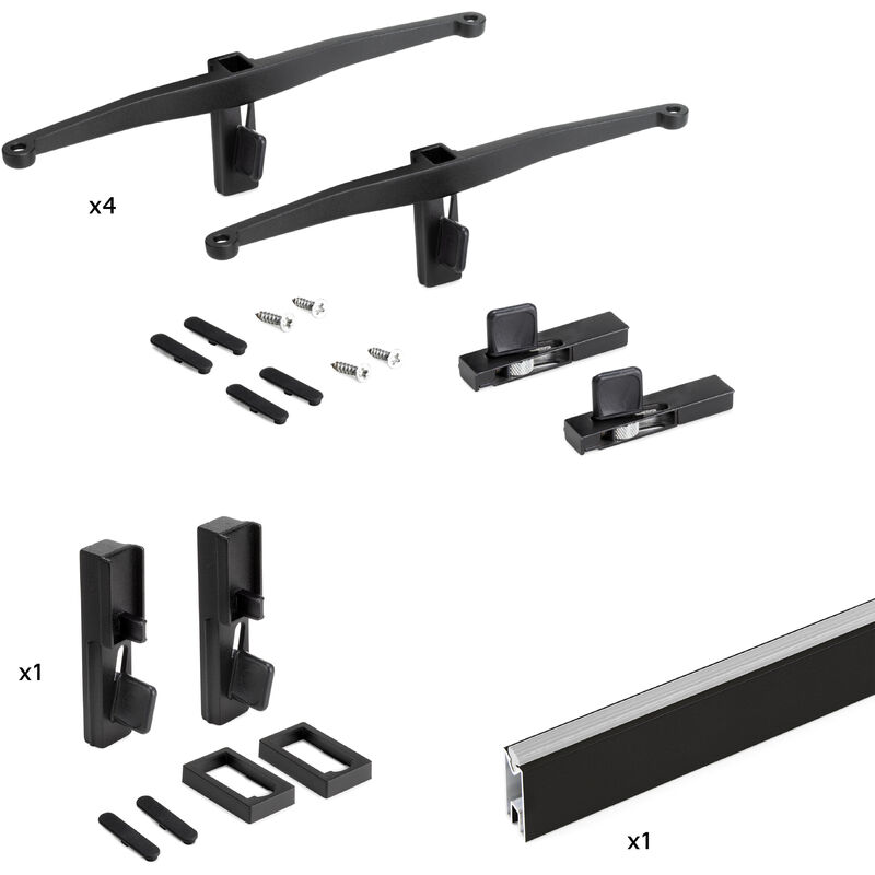Kit staffe per struttura modulare Zero. Si compone di 4 set di staffe per mensole in legno, 1 set di staffe per barra e una barra per appendere da 1 m. Include tutti gli accessori per il montaggio sul profilo. Profili e accessori Zero per scaffalature modulari. I profili sono realizzati in alluminio, e gli accessori di giunzione e i supporti in zamak, il tutto in finitura di vernice nera testurizzata (RAL 9005). Grazie alla sua semplicit� e al suo design, si pu� adattare velocemente il sistema Zero a qualsiasi tipologia di ambiente: casa, cabine armadio, ufficio e negozi. Si possono combinare diversi elementi per creare la tua composizione ideale: mensole in legno o vetro, moduli o piccoli contenitori e barre appendiabiti. Il sistema Zero si caratterizza per la sua facilit� di montaggio, poich� non � necessario utilizzare alcun attrezzo per la regolazione. Regola e posiziona i ripiani senza dover smontare nulla e senza attrezzi speciali. Grande capacit� di carico poich� pu� supportare