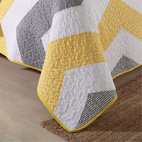 ENCOFT 3 Pezzi Patchwork a Mano Copriletto Trapuntato Matrimoniale 240x270cm con 2 Federe 50x70cm, in 100% Cotone, Strisce Double Face Trapunta, Giallo Bianco Grigio