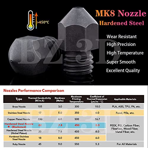 The Hardened steel nozzles, each of which is molded by five axle CNC.Higher temperature, Higher Wear Resistance, Better Durability.Can be perfectly compatible with special filaments such as PEI, PEEK,carbon,fiber mixture, glass fiber mixture, and other materiels. (Tolerance 0.01 mm).