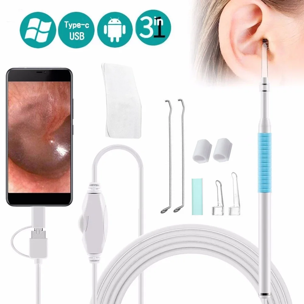 Ear Endoscope 3 in 1 Ear Cleaning Tool HD Visual Ear Spoon Multifunctional Earpick 5.5mm Mini Camera Android PC Ear Otoscope
