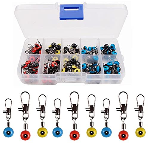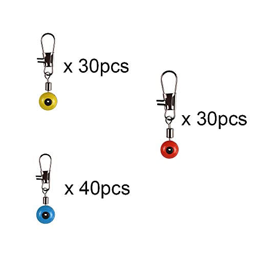 Kit girelle da pesca: la confezione include 30 connettori a clip con gambo girevole rosso, 30 connettori a clip con gambo girevole giallo, 40 connettori a clip con gambo girevole blu, 100 pezzi in totale.