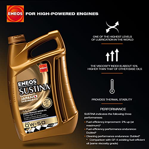 ENEOS SUSTINA 0W-50 - Olio Motore - Engine Oil - per Motori Potenti - Completamente Sintetico con Additivi Organici - Aumenta L'efficienza del Motore (4 Litri)