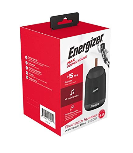 Energizer BTS-061 Speaker Bluetooth portatile con power bank, microfono per chiamate in vivavoce, modalità FM, compatibile con smartphone/tablet e dispositivi MP3, Nero