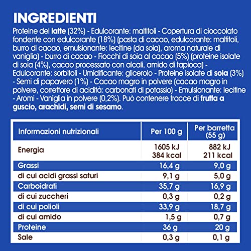 CHOCO & VANILLA DREAM: Barretta proteica low sugar, con 20g di proteine e copertura di cioccolato fondente. Gusto vaniglia e cioccolato. Senza glutine