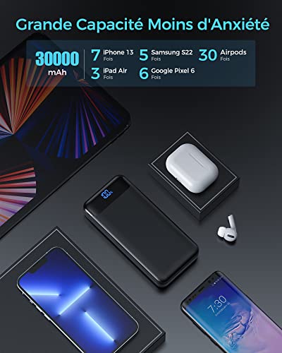 Batteria di emergenza di grande capacità: con una capacità massiva di 30.000mAh, il nostro caricatore esterno può caricare il tuo iPhone fino a 7 volte, Samsung Galaxy S20 fino a 6 volte, Huawei P60 fino a 6 volte e Xiaomi fino a 5 volte. Puoi rimanere connesso tutto il giorno senza paura di essere a corto di energia.