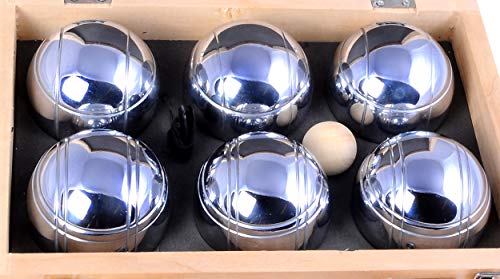 Set con sfere in metallo per giocare alla variante petanca " triplette" composto da 6 elementi di peso di 720 grammi e di diametro 74 mm.la scatola viene completata da 1 pallini in legno e 1 misuratore distanze.