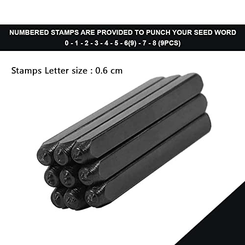 È possibile incidere rapidamente sulle piastre di semi utilizzando il punzone numerico. La nostra piastra in acciaio inox di spessore 85 mm × 54 mm x 1 mm è abbastanza grande per incidere le parole di seme Mnemonic corrispondono ai numeri (ledger/trezor standard).