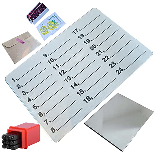 Il set comprende una singola piastra numerata in acciaio inox misura 85 mm x 54 mm x 1 mm di spessore, una piastra in acciaio da 50 mm x 50 mm (questo è quello di praticare punch), un kit di timbri numerici, una busta portaoggetti, due adesivi antimanomissione e due salviettine al limone.