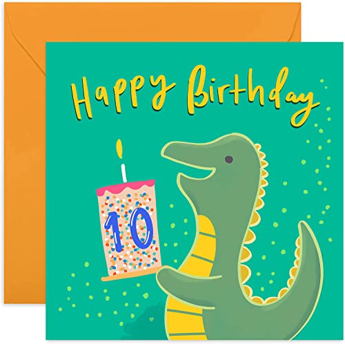 Old English Co. Biglietto d'auguri per 10° compleanno con dinosauro - Biglietto quadrato per auguri di decimo compleanno | Adatto per bambino, figlio, figlia, bambino, interno vuoto e busta inclusa