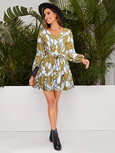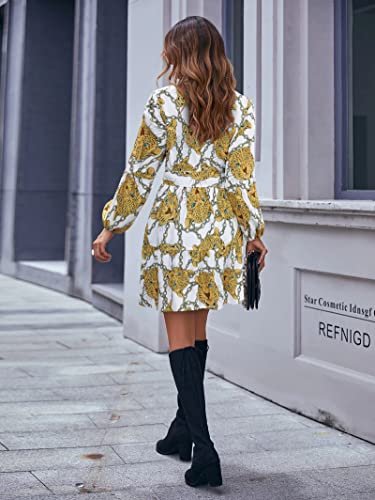 Enmain Vestito Casual da Donna Swing Vestito Giallo a Maniche Lunghe con Scollo a V Stampato Leopardo Giallo Vestito a Tunica con Scollo a V Allentato e fluente con Tasca e Cintura