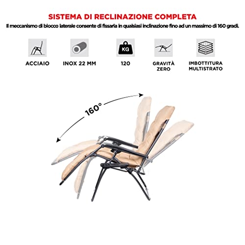 PRATICA E FUNZIONALE: Il cuscino della seduta è imbottito con spugna indeformabile ad alta densità spesso 8 cm ed è rimovibile e lavabile. Il meccanismo di blocco laterale consente di reclinarla e fissarla in qualsiasi inclinazione fino a 160 gradi. Dotata di tavolino portaoggetti per riporre comodamente cellulare, telecomando, bibite, libri e riviste. Essendo richiudibile e leggera, può essere spostata da un luogo all'altro senza impedimenti o portata con voi in vacanza.