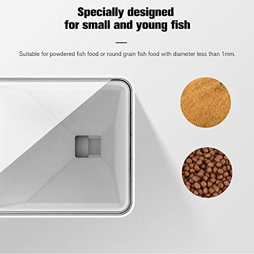 Alimentato a batteria, durevole. 3 batterie AAA bastano per durare tre mesi. Quando la batteria è scarica, l'indicatore LED emetterà un allarme. Appositamente progettato per pesci piccoli e giovani, adatto per mangime per pesci in polvere o mangime per pesci a grani tondi con diametro inferiore a 1 mm.
