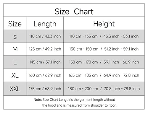 Consiglia di Taglia: Se preferisci un mantello che cade a terra, scegli la dimensione consigliata nella tabella delle taglie, Se preferisci un mantello al ginocchio, puoi scegliere la taglia più piccola di quella consigliata.