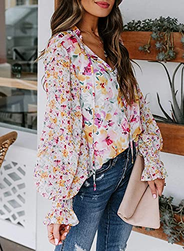 Eogrokerr - Camicetta da donna in chiffon, stile casual, con stampa floreale, scollo a V, maniche lunghe, con coulisse, Aa rosa., M