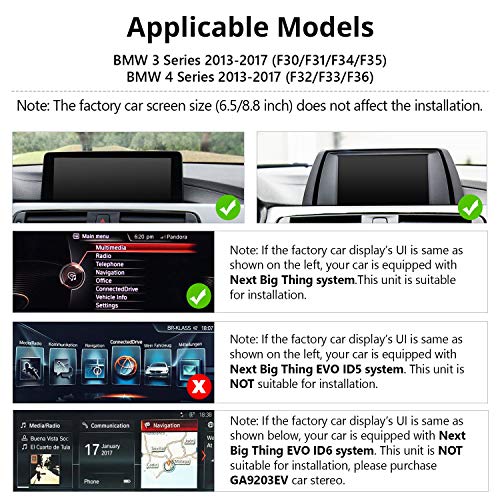 Dopo l'installazione, si prega di notare: impostare il tipo di auto in primo luogo. Se il display originale dell'automobile è di 6,5 pollici, si prega di impostarlo su 1.F1X F2X F3X F4X (2013-2017) NBT 6,5 pollici, se è 8,8/10,3 pollici, si prega di impostarlo su 9.F1X F2X F3X F4X (2013-2017) NBT 3) 3) 3.17). 8/26. 0 cm. Adatto per la vostra BMW Serie 3 2013,2014,2015,2016,2017 (F30/F31/F34/F35)/BMW Serie 4 2013,2014,2015,2016,2017 (F32/F33/F36), GPS integrato