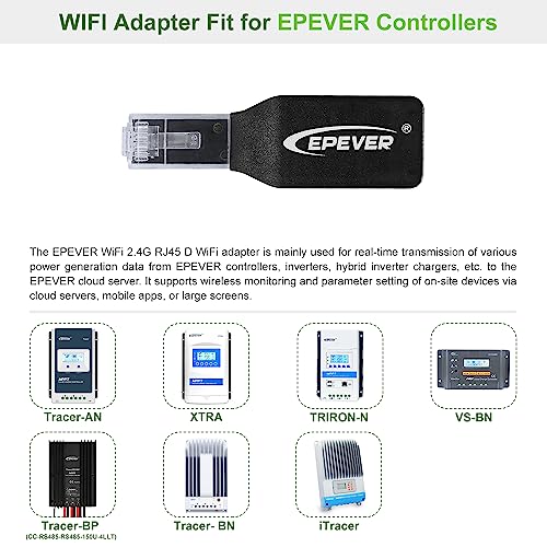 ☆ (EPEVER-WiFi-2.4G-RJ45-D) supporta il monitoraggio locale e la modalità di funzionamento "EPEVER Cloud". (Nota: attualmente c'è un bug nell'APP, caricheremo un video elenco su come utilizzare l'adattatore WiFi tramite la modalità di rete WiFi 2.4G dopo che l'APP è stata risolta)