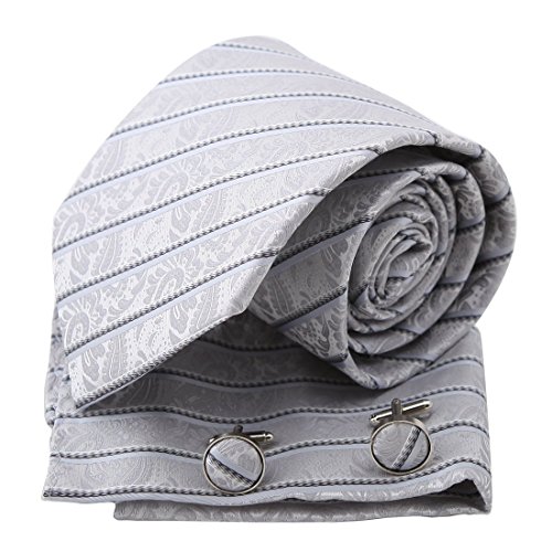 Epoint PH1152 Grigio Stripes Wedding Souvenir Cravatta in seta Fazzoletti gemelli Presente Box Set grigio chiaro dei gemelli del Mens Tie By