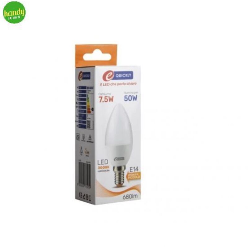 Lampadina Led prodotto dal brand E-Quickly. Lampadina con attacco E14, conpotenza di 7,5W può generare 680 lumen, luce bianca calda perfetta 3000K, l'efficienza della luce è uniforme e omogenea. La lampadina corrisponde ad una lampadina a incandescenza convenzionale da 50 W.La confezione contiene una lampadina.