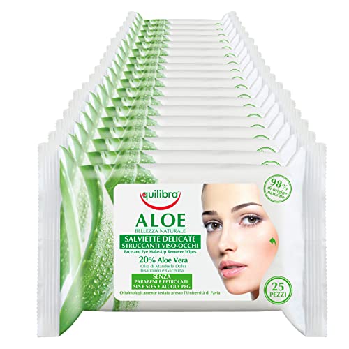 18x Equilibra Aloe Bellezza Naturale Salviette Struccanti Delicate Viso Occhi Lenitive Emollienti Idratanti Detergenti Nutrienti Rinfrescanti Tessuto Liscio - 18 Confezioni da 25 Salviettine ciascuna
