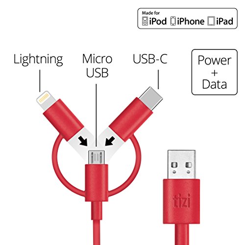 Equinux Tizi Schlitzohr - USB-C, Lightning And Micro-USB Multifunctional Cable (1m, Red) Mfi Certified, Compatible with iPhone, iPad